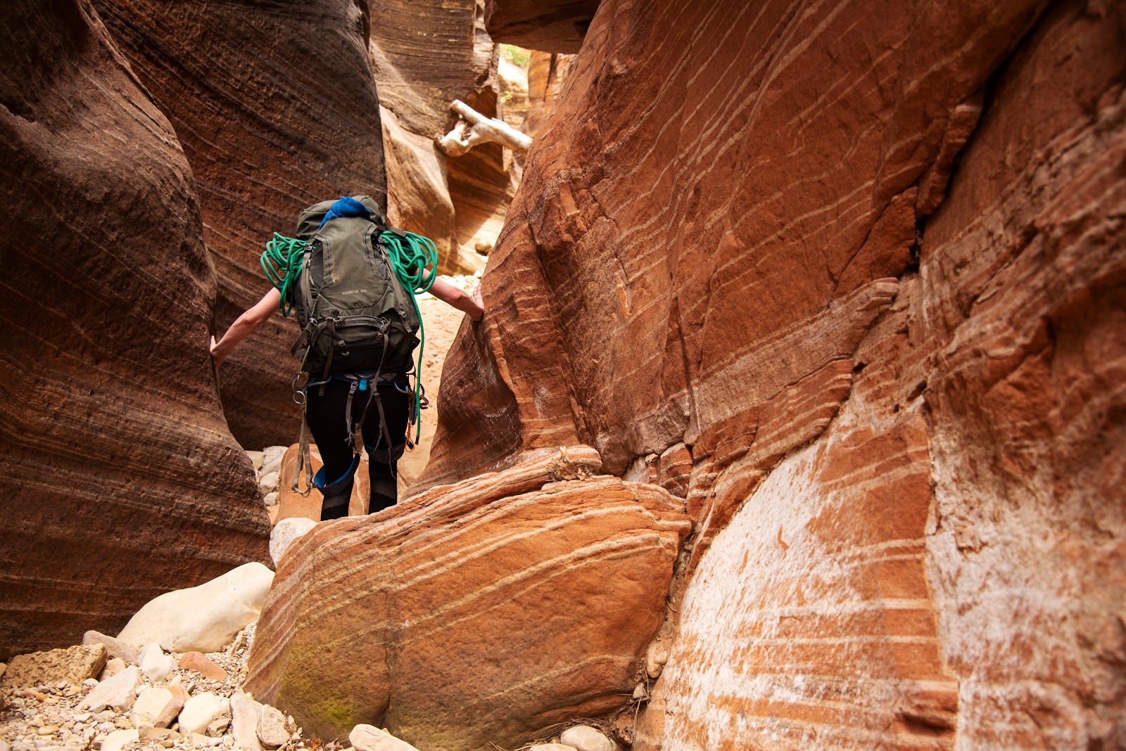 Before we continued upward, I wanted to check a side canyon that was a bit steep but appeared to have an interesting feature from the bottom. Once I was able to scramble my way up, I walked up to the bottom of a dry fall with numerous flowstone features, popcorn, and a dark hole with columns that led deeper into a cave. It was at this point I realized I found lavender cave.
